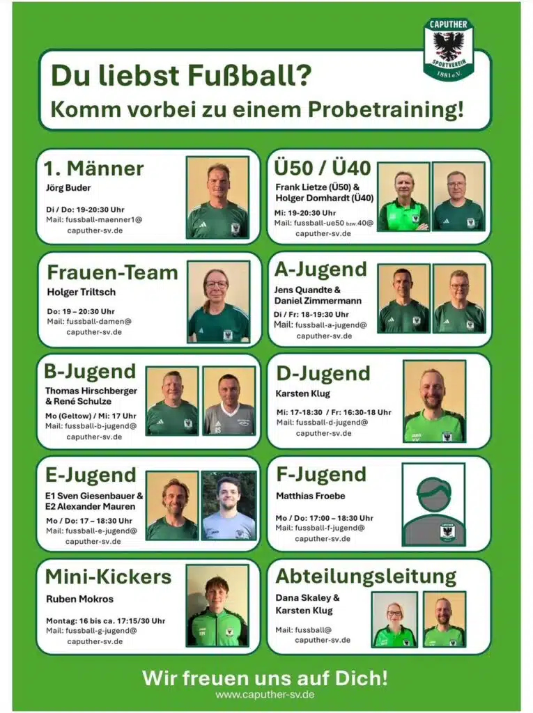 Bei Fragen oder Interesse könnt ihr euch gerne an die zuständigen Ansprechpartner der jeweiligen Mannschaft wenden. Namen, Telefonnummern und Trainingszeiten findet ihr im Menü unter der entsprechenden Mannschaft.